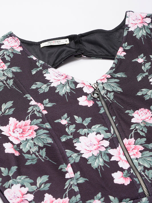 Black Poly Blend Lycra Fabric Floral Printed Dress With Organza Sleeves