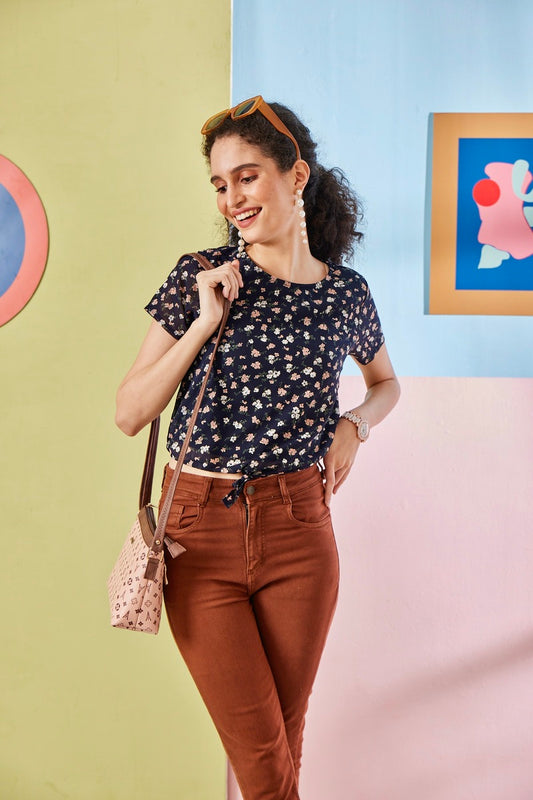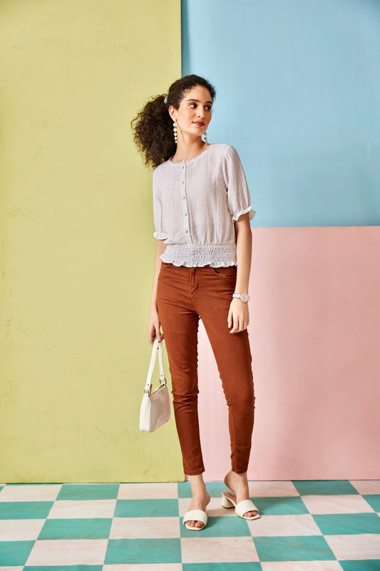 Grey Half Sleeve Crop Top With Ruffled Edges