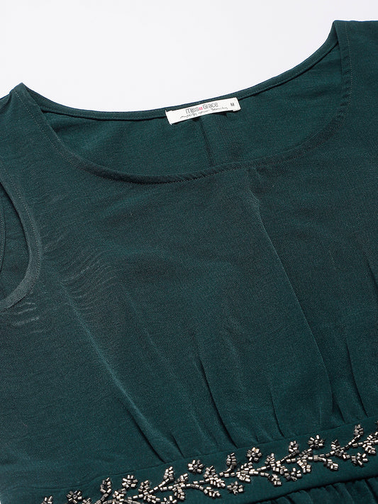 Bottle Green Woven Formal Dress With Embroidered Waist Band & Side Zip