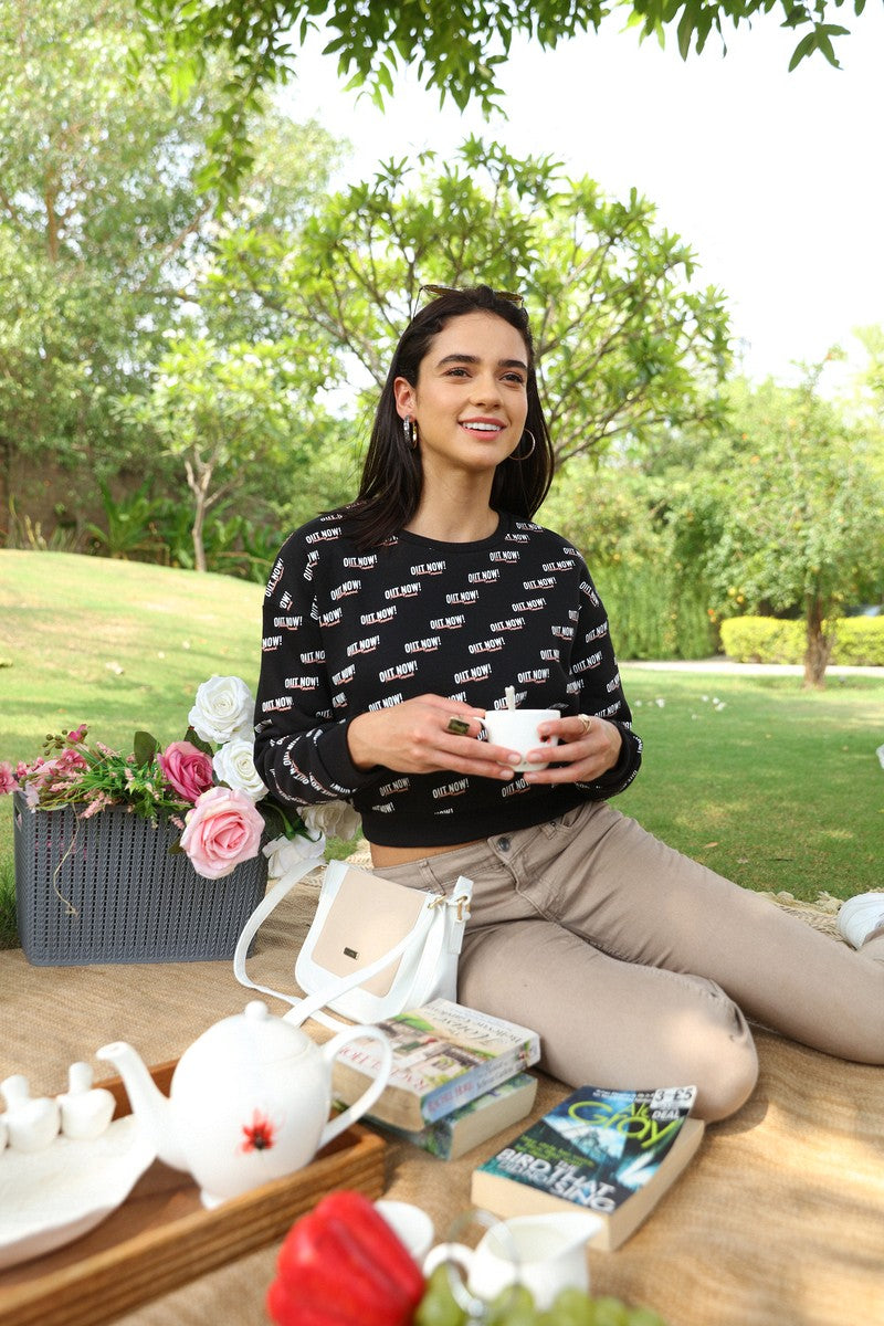 Black Printed Round Neck Anti Fit Crop Sweat Shirt