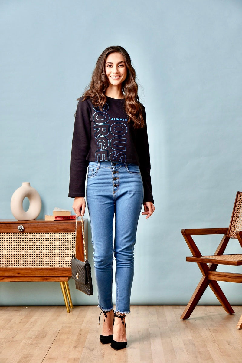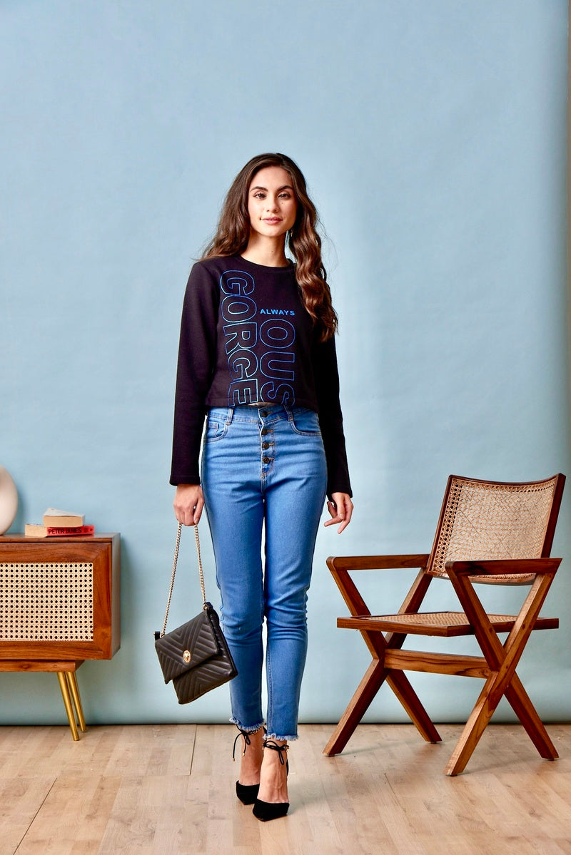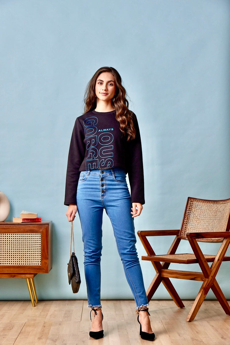 32604 - Rock the trend in this Black Print Crop Sweat Shirt! Perfect for a casual yet stylish look, this sweatshirt is sure to become your new favorite.