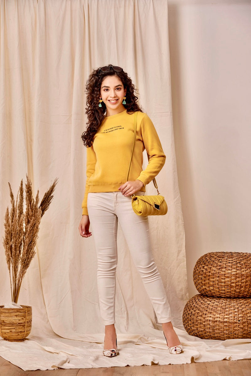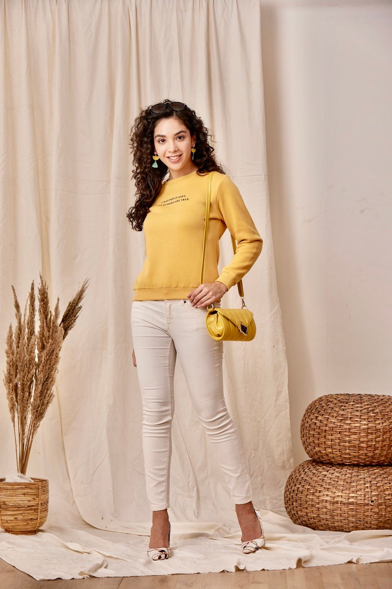 32670 - This Gold Basic Slogan Print Sweat Shirt is just what your wardrobe needs! Add a touch of witty charm with this bold and playful piece.