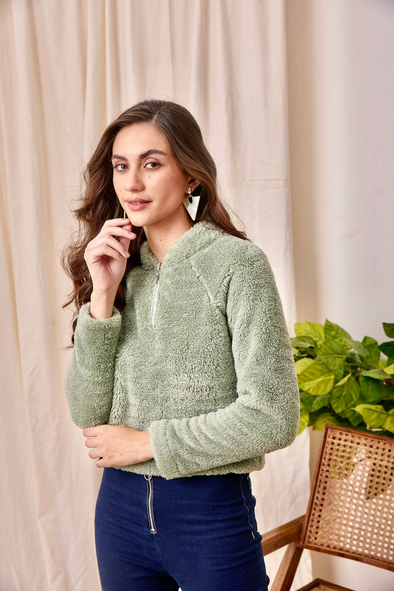 32696 - This green half-zip fur sweat shirt is the perfect way to look chic while staying cozy! So zip up and strut your stuff!
