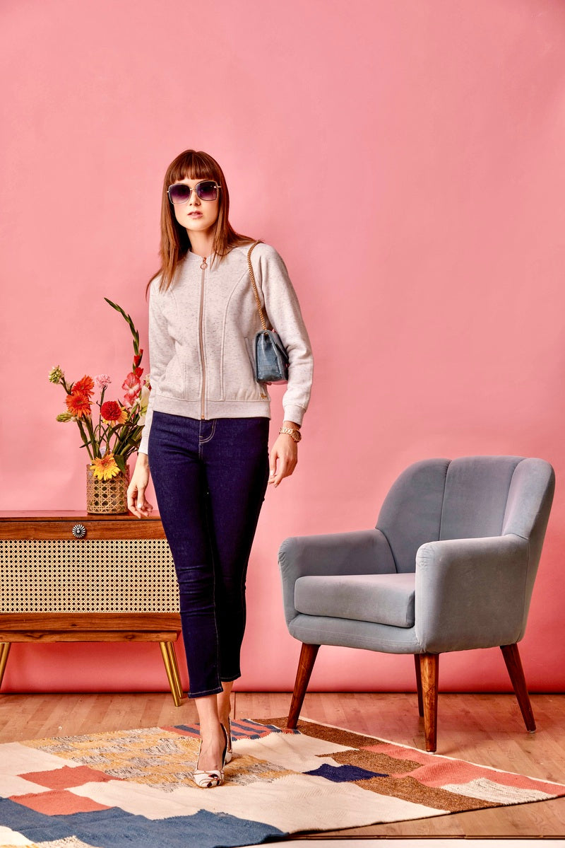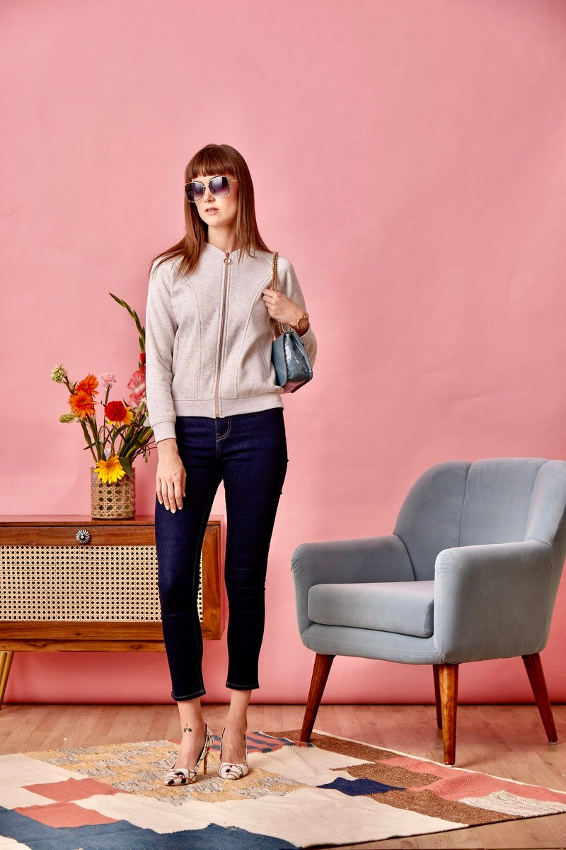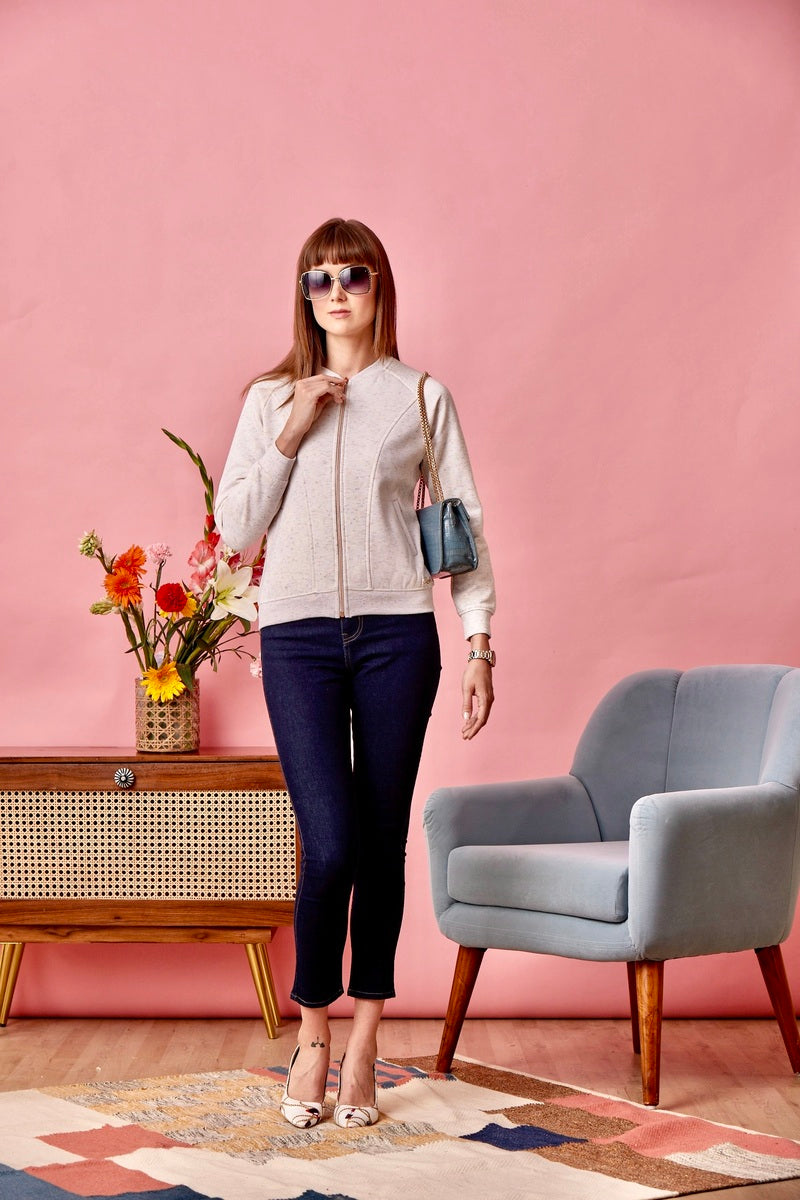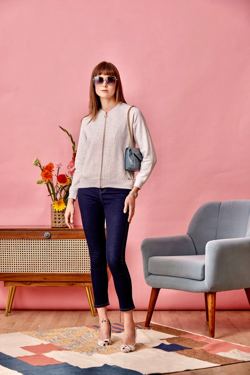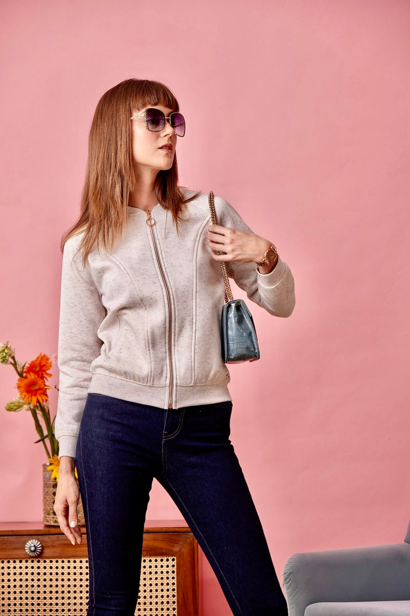 32721 - Zip yourself into this Off White Melange Zipper Sweat Shirt - the perfect blend of style and comfort!