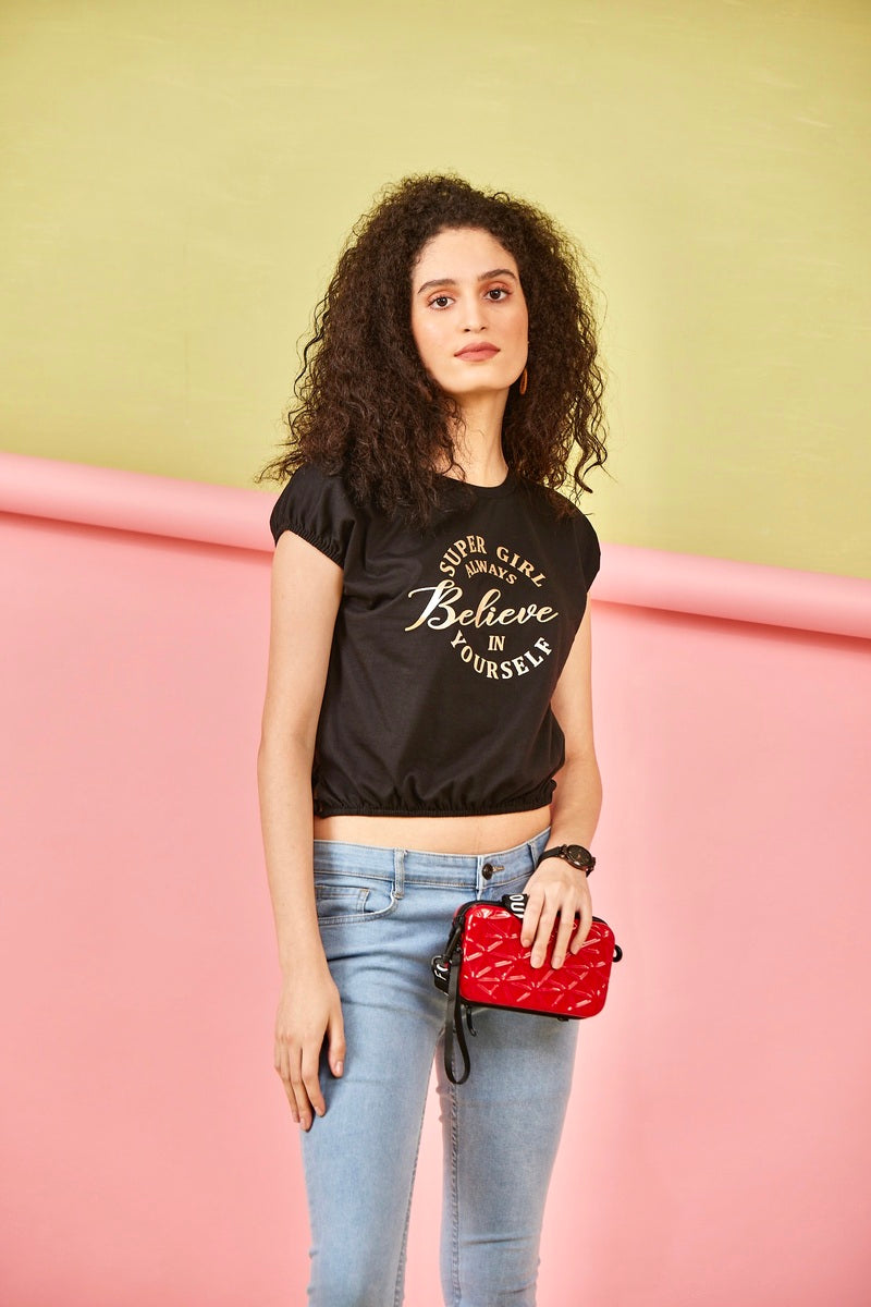 33132 - The Black Believe Crop Top is for the cool and confident, adding a touch of quirky fun to your wardrobe.