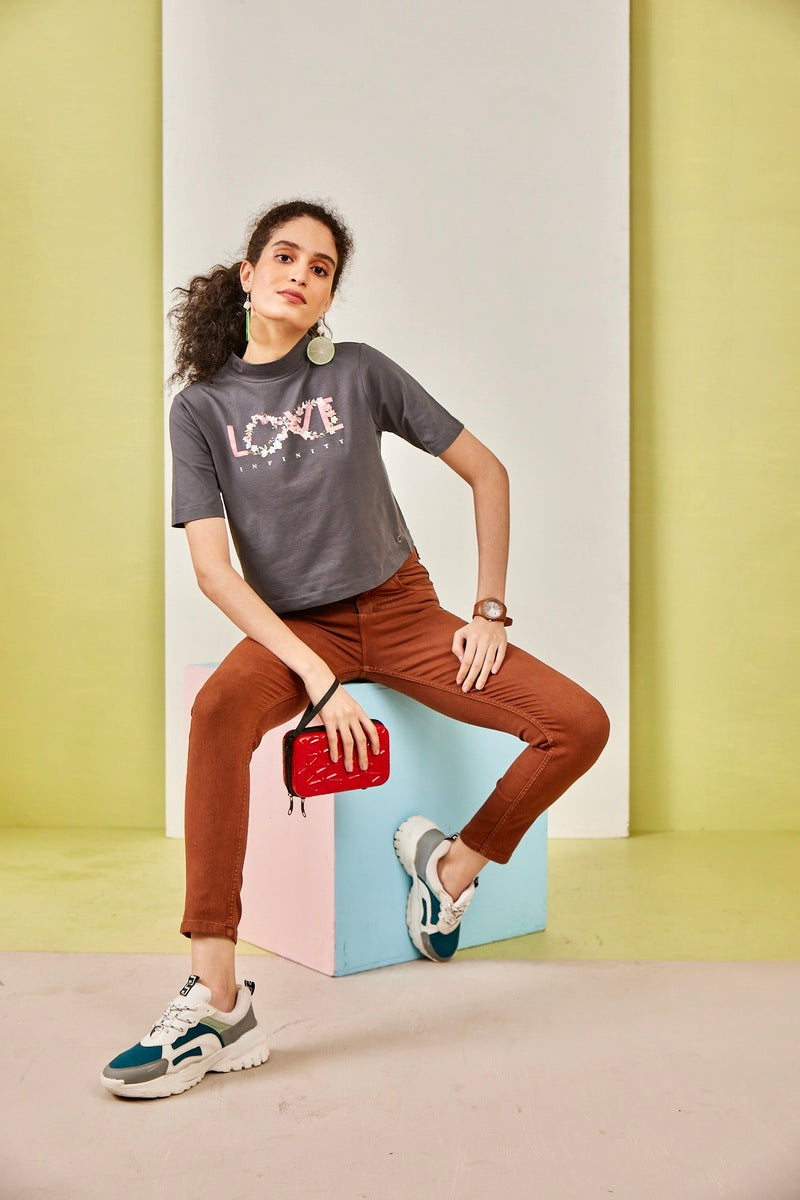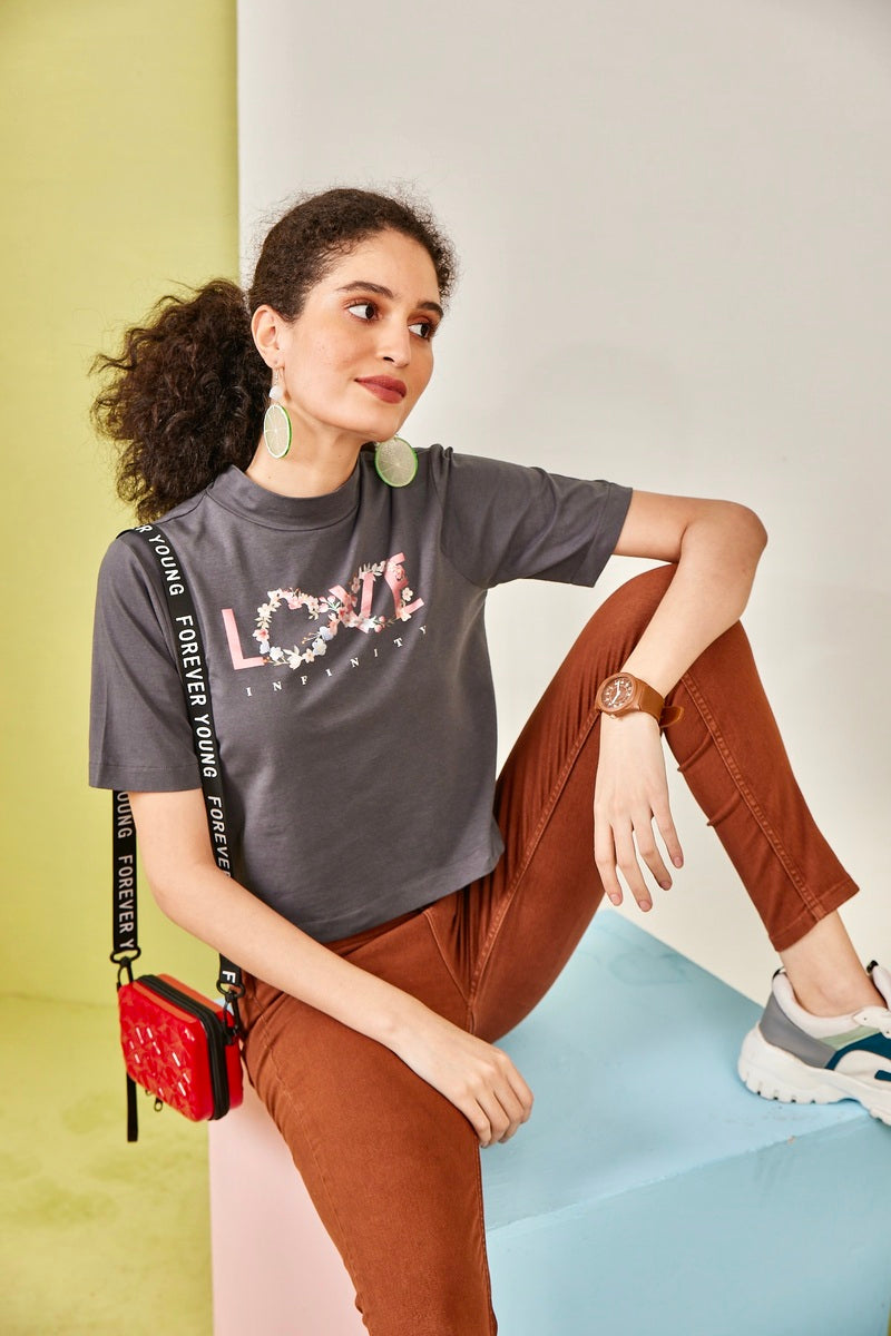 33147 - Get ready to slay in this Grey T Neck Love Crop Top! Perfect for any stylish and playful gal, this crop top will add a touch of fun and quirkiness to any outfit.