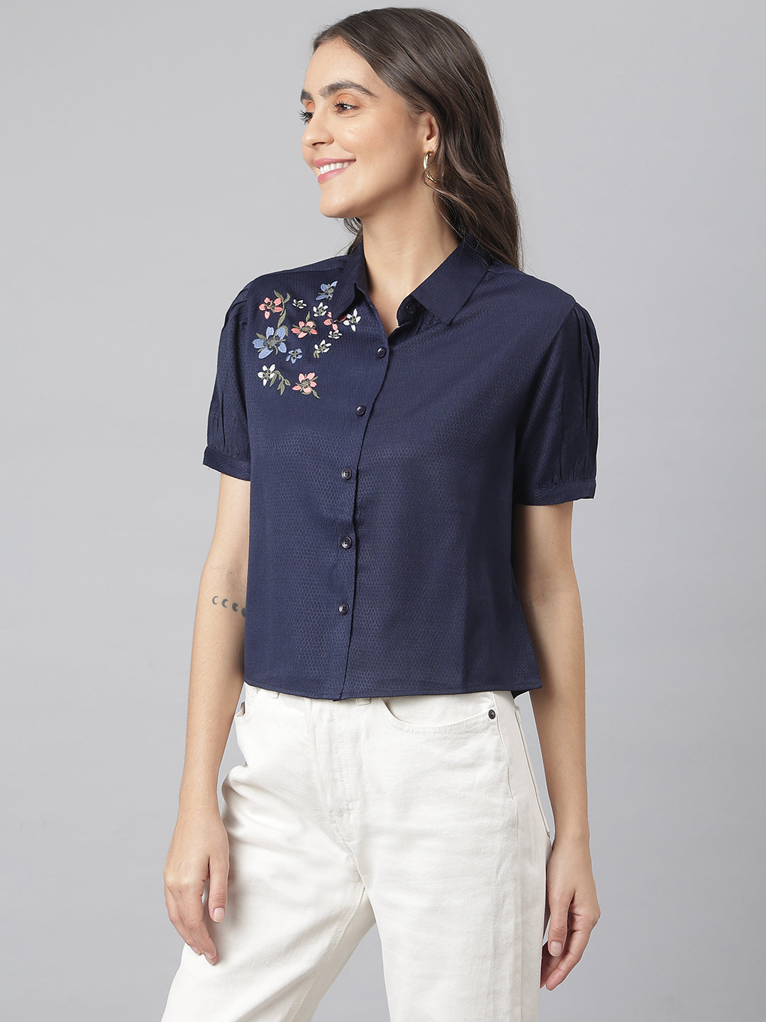 This snazzy Navy Buttoned Shirt (Top) is a collared wonder with embroidered flowers!