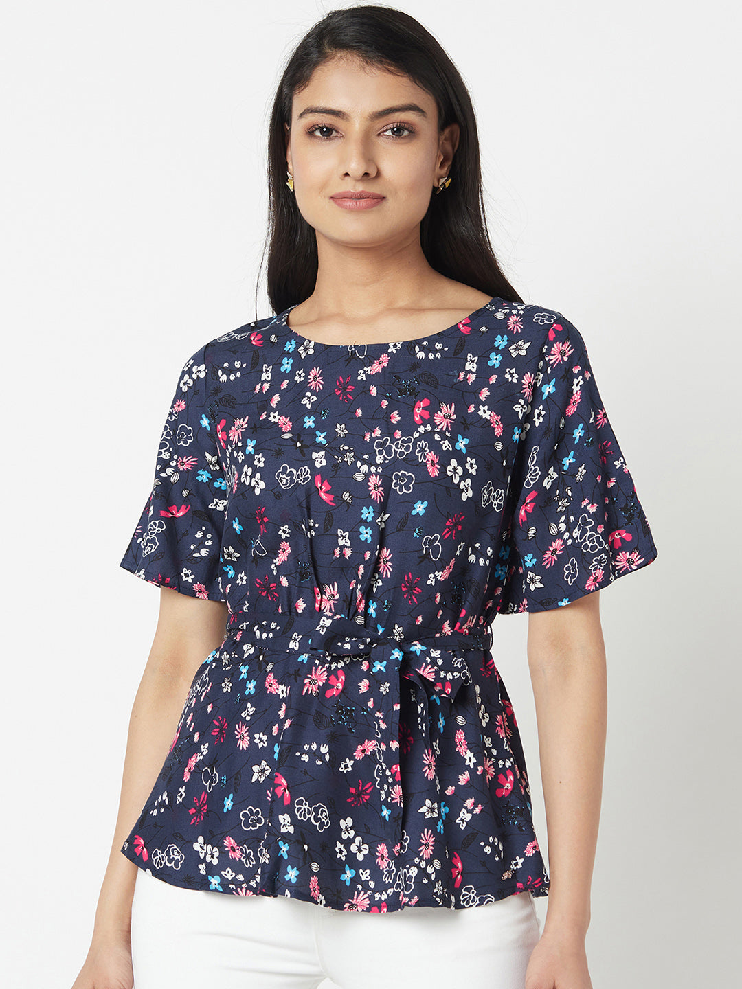 Navy Blue Round Neck Woven Cotton Rayon Top With Belt